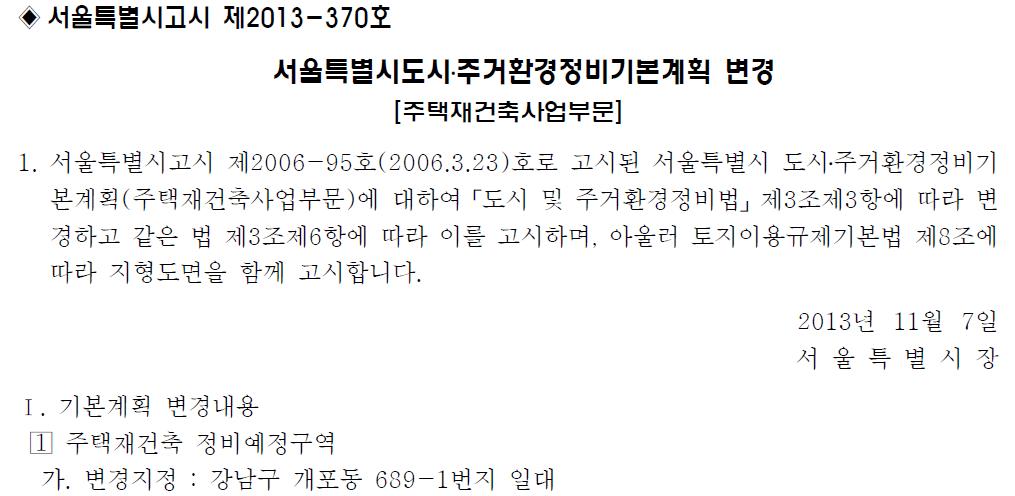 ¼¿ï½Ã´Â 16ÀÏ¡®Á¦17Â÷ µµ½Ã°èȹÀ§¿øÈ¸¡¯¸¦ °³ÃÖÇØ °³²±¸ ÀÏ¿øµ¿ 689-1¹øÁö ÀÏ´ëÀÇ ¡®Á¤ºñ±âº»°èȹ(Àç°ÇÃàºÎ¹®) º¯°æ¾È¡¯(ÀÌÇÏ "º¯°æ¾È")À» Åë°ú½ÃÄ×´Ù.