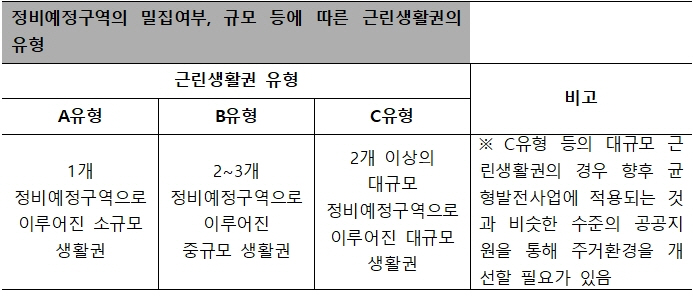 ¼¿ï½Ã´Â 299°³ÀÇ Á¤ºñ¿¹Á¤±¸¿ªÀ» ´ë»óÀ¸·Î ÇÏ¿© ±Ù¸°»ýȰ±ÇÀ» ¼³Á¤ÇÏ¿´´Ù. ÀÌ ±Ù¸°»ýȰ±ÇÀº ¹ÐÁýÁ¤µµ¿¡ µû¶ó A, B, C 3°¡Áö À¯ÇüÀ¸·Î ºÐ·ùµÈ´Ù.