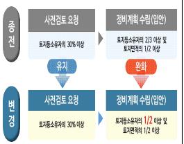 ∙(Áֹε¿ÀÇÀ²) »ç¾÷ Ãʱ⿡ Áֹΰ¥µîÀ» ÃÖ¼ÒÈÇÏ°í »ç¾÷ÀÇ ½ÇÇö°¡´É¼ºÀ» Á¦°íÇϱâ À§ÇØ ½Å±Ô ÁÖÅÃÁ¤ºñÇü Àç°³¹ß±¸¿ª ÁöÁ¤À» À§ÇÑ »çÀü°ËÅä ¿äû ½Ã Áֹε¿ÀÇÀ²Àº 10% À̻󿡼 30% ÀÌ»óÀ¸·Î º¯°æÇϸç, ÁÖ¹ÎÀǰ߿¡ µû¶ó ½Å¼ÓÈ÷ »ç¾÷ ÃßÁø¹æÇâ °áÁ¤µîÀÌ °¡´ÉÇϵµ·Ï Á¤ºñ°èȹ(¾È) ¼ö¸³´Ü°èÀÇ Áֹε¿ÀÇ ±âÁØÀ» ÅäÁöµî¼ÒÀ¯ÀÚÀÇ 2/3 ÀÌ»ó ¹× ÅäÁö¸éÀûÀÇ 1/2 À̻󿡼 ÅäÁöµî¼ÒÀ¯ÀÚÀÇ 1/2 ÀÌ»ó ¹× ÅäÁö¸éÀûÀÇ1/2 ÀÌ»óÀ¸·Î º¯°æÇÑ´Ù.