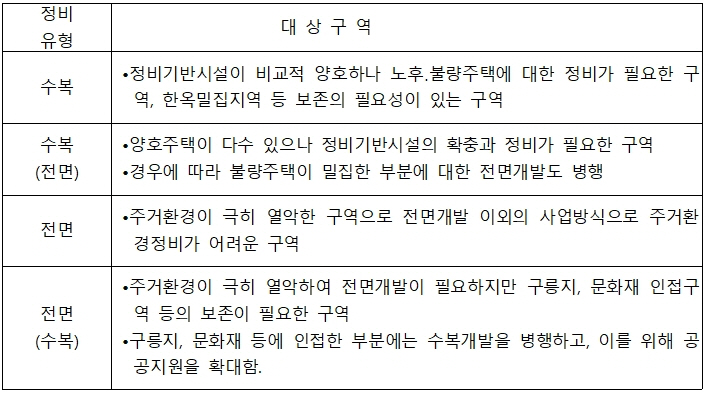 Á¤ºñ¿¹Á¤±¸¿ªº° ±ÇÀåÇϰí ÀÖ´Â Á¤ºñÀ¯ÇüÀº Áö¿ª ¿©°Ç¿¡ µû¶ó 4°¡Áö·Î ±¸ºÐÇϰí ÀÖÀ½. Àü¸é°³¹ßÀº Á¤ºñ±¸¿ª ÀüüÀÇ ±âÁ¸ °ÇÃ๰À» ö°ÅÇÏ¿© »õ·Î¿î ¾ÆÆÄÆ®¿Í °ø°ø¿ëÁö¸¦ °³¹ßÇÏ´Â ÇüÅÂÀÌ´Ù. ÇÕµ¿°³¹ßÀº Àü¸é°³¹ßÀÇ ´ëÇ¥ÀûÀÎ ÇüŶó ÇÒ ¼ö ÀÖ´Ù.