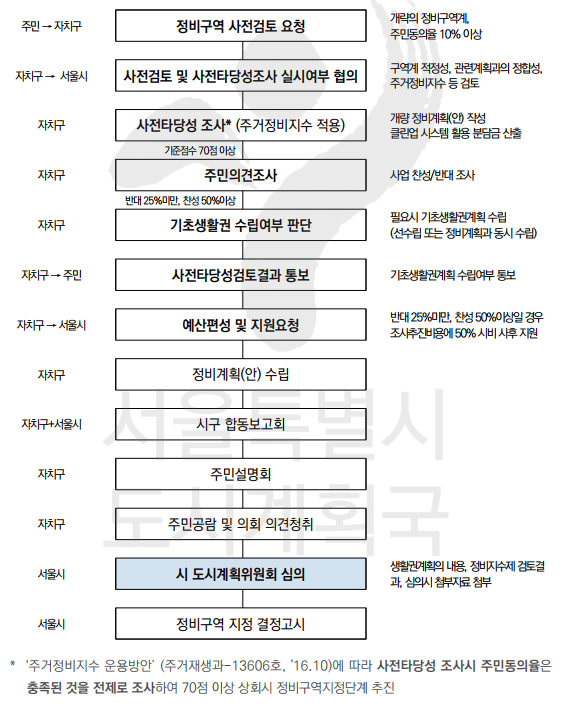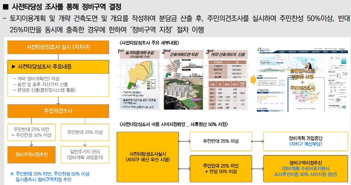 µÑ°, ÁÖ°Åȯ°æ°³¼±»ç¾÷ÀÇ ½ÃÇàÀÚÁöÁ¤ µ¿ÀÇ »êÁ¤ ±âÁذúÀÇ °ü°èÀÌ´Ù. ³ëÈÄ¡¤ºÒ·®°ÇÃ๰ÀÌ ¹ÐÁýÇÏ´Â µî ÁÖ°Åȯ°æ°³¼±±¸¿ªÀÇ ¿ä°Ç¿¡ ÇØ´çÇÏ´Â ±¸¿ª¿¡ ´ëÇØ Á¤ºñ°èȹÀ» ¼ö¸³ÇÏ¿© 14ÀÏ ÀÌ»ó Áֹο¡°Ô ¹ý Á¦15Á¶Á¦1Ç׿¡ µû¸¥ °ø¶÷․°ø°íÀÏ ÇöÀç, Á¤ºñ¿¹Á¤±¸¿ªÀÇ ÅäÁö ¶Ç´Â °ÇÃ๰ÀÇ ¼ÒÀ¯ÀÚ ¶Ç´Â Áö»ó±ÇÀÚÀÇ 2/3 ÀÌ»óÀÇ µ¿ÀÇ¿Í À§ÀÇ °ø¶÷․°ø°íÀÏ 3¿ù ÀüºÎÅÍ ´çÇØ Á¤ºñ¿¹Á¤±¸¿ª ¾È¿¡ 3¿ù ÀÌ»ó °ÅÁÖÇϰí ÀÖ´Â ¼¼ÀÔÀÚÀÇ °ú¹Ý¼ö µ¿ÀǸ¦ ¾ò¾î¾ß ÇÑ´Ù(¹ý Á¦24Á¶Á¦3Ç× ÂüÁ¶).