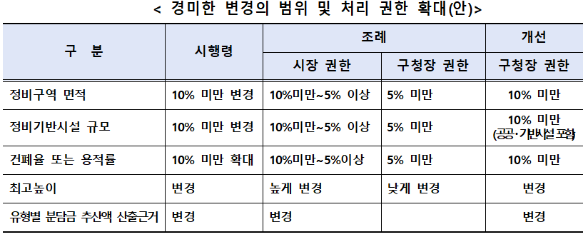 Á¤ºñ±¸¿ª ¸éÀû ¹× Á¤ºñ±â¹Ý½Ã¼³ ±Ô¸ð¸¦ ºñ·ÔÇÑ ¡®°æ¹ÌÇÑ º¯°æ¡¯ »çÇ×Àº ±¸Ã»ÀåÀÌ Á÷Á¢ Àΰ¡Çϵµ·Ï ÀÚÄ¡±¸¿¡ ±ÇÇÑÀ» È®´ë ºÎ¿©ÇÑ´Ù. À̸¦ À§ÇØ ½Ã´Â ¿¬³» ¡®µµ½ÃÁ¤ºñÁ¶·Ê¡¯¸¦ °³Á¤ÇÒ ¹æÄ§ÀÌ´Ù.
